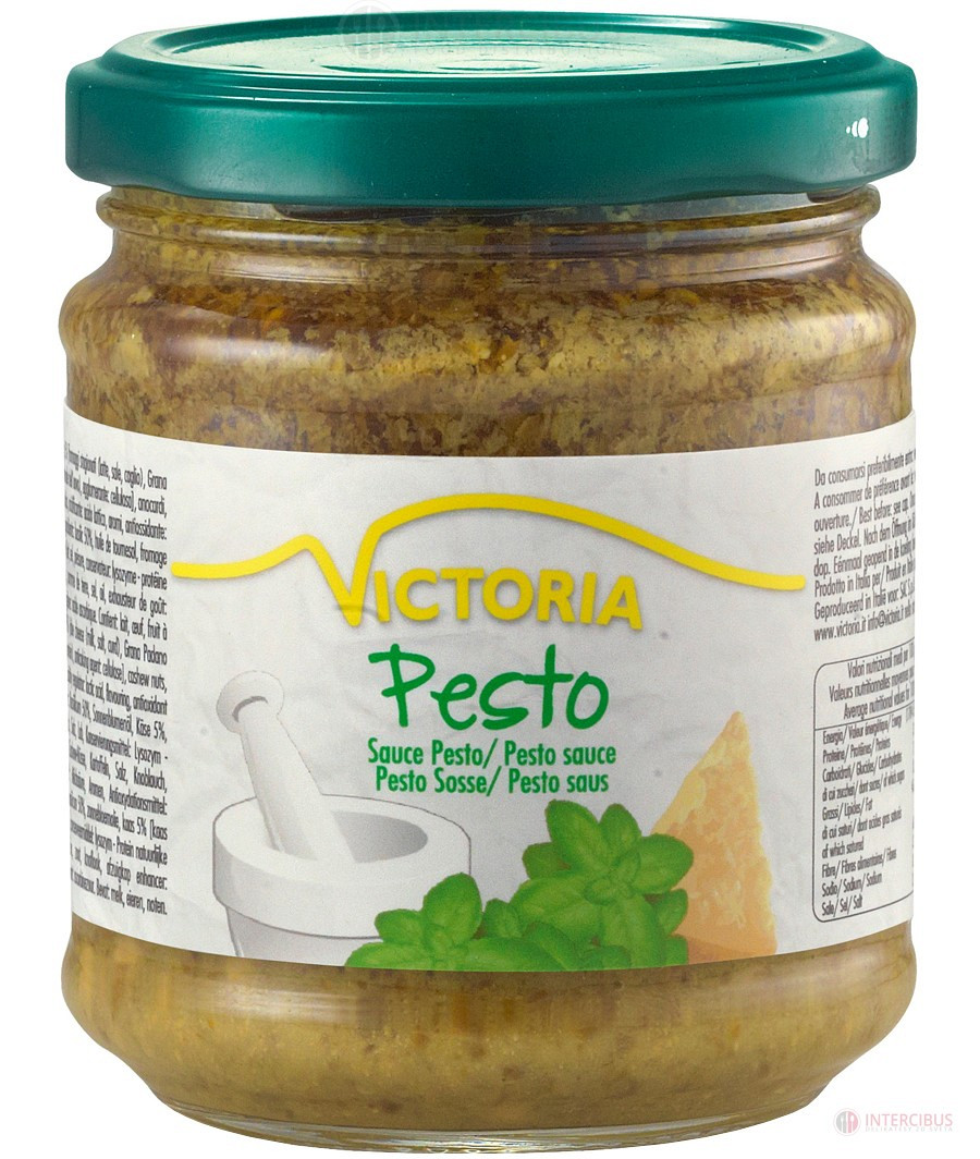 Bazilika 46,7%, sončnično olje, glukozni sirup, sir 5% (zreli siri 79% (mleko, sol, skuta), sir Grana Padano 20% (mleko, sol, skuta, konzervans: lizosomi – naravne jajčne beljakovine), sredstvo proti sprijemanju: celuloza), indijski oreščki, krompir, sol, česen, sredstvo za uravnavanje kislost: mlečna kislina, ojačevalec okusa: mononatrijev glutaminat, naravne arome, antioksidant: askorbinska kislina.