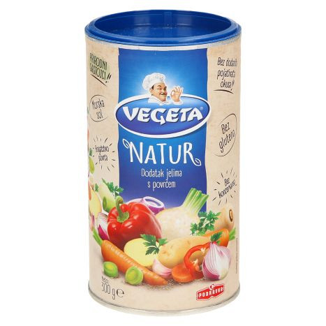 Morska sol, sušena zelenjava 32% (korenje, rebrinec, čebula, krompir, zelena, paradižnik, por, paprika, list peteršilja), sladkor, luštrek, črni poper, kurkuma, česen, koper.