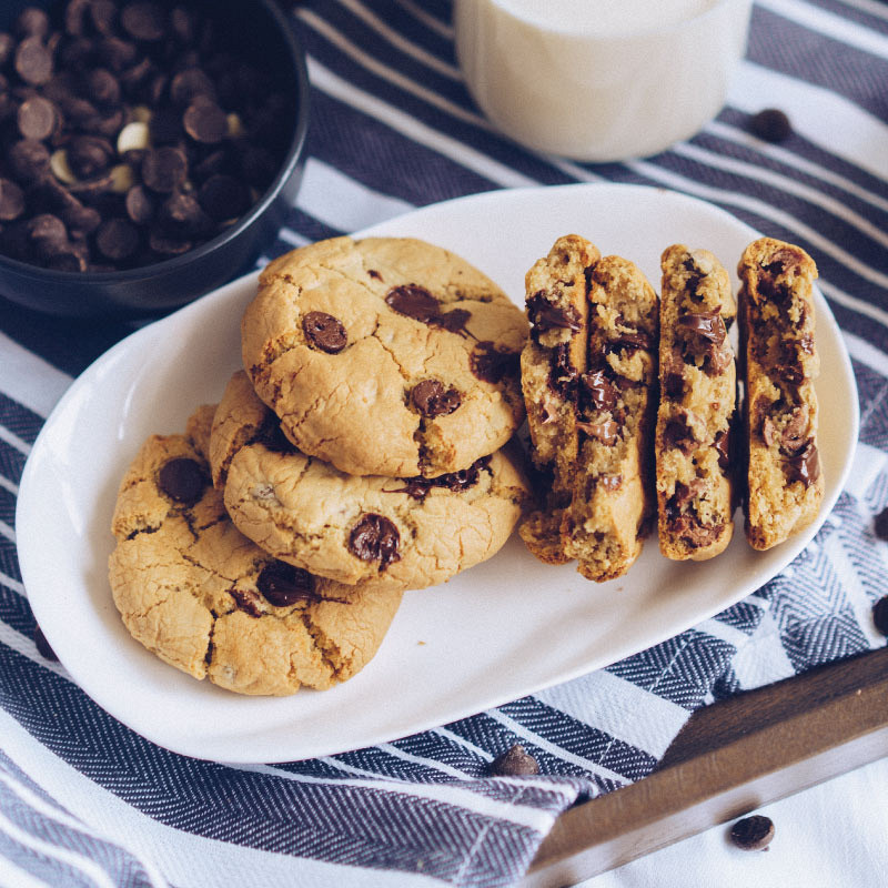 Z mešalnikom zmešajte maslo in sladkor, dokler zmes ni bleda in gladka. Dodajte jajce in premešajte. Dodajte presejano moko in sol. Vmešajte čokoladne koščke. Vsako kroglico razvaljajte v testo, ki tehta 45 g (če je testo za piškote preveč lepljivo, potresite z moko). Pecite pri 180 stopinjah, 8–10 minut oziroma dokler ne postane zlato rjavo.