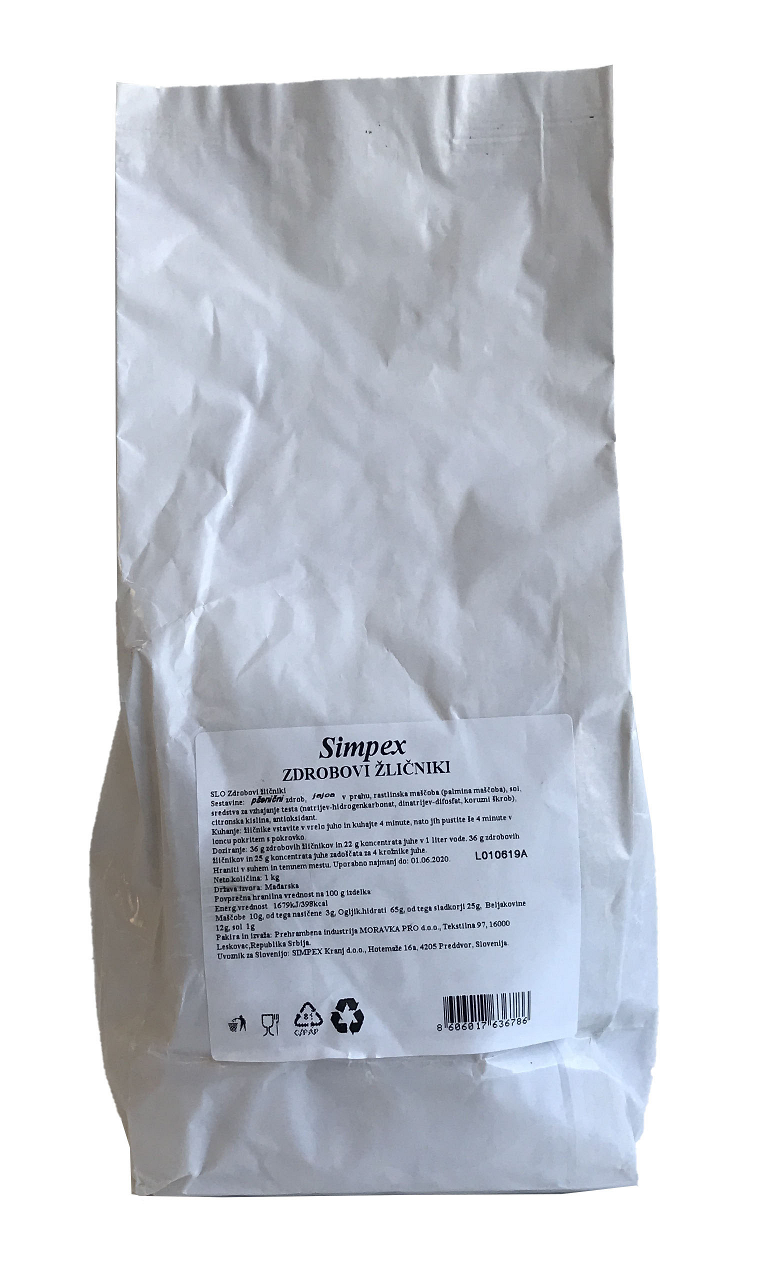 Pšenični zdrob, jajca v prahu, rastlinska maščoba (palmina maščoba), sol,sredstvo za vzhajanje testa (natrijev-hidrokarbonat, dinatrijev-difosfat, koruzni škrob), citronska kislina, antioksidant.